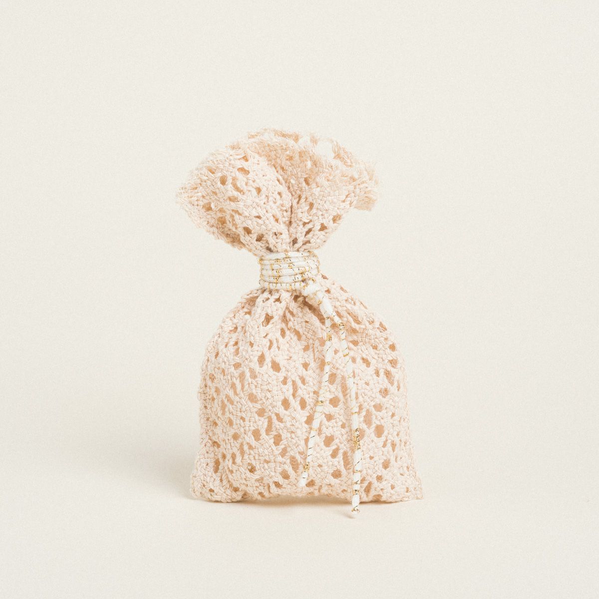 Το πλεκτό πουγκί αποτελεί βάση για μια κομψή και ιδιαίτερη μπομπονιέρα.
