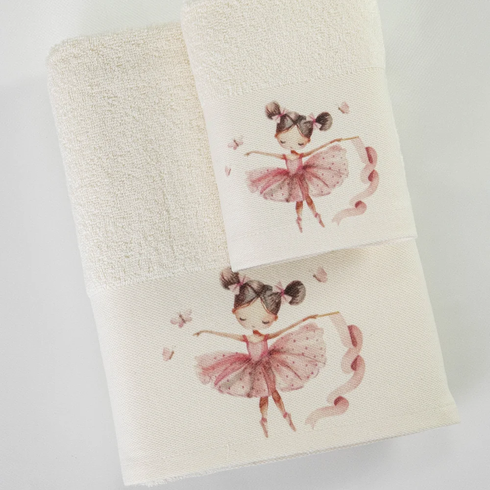 Original price was: 19.12€.16.28€Η τρέχουσα τιμή είναι: 16.28€.Σετ πετσέτες 2 τεμαχίων, μπάνιου και χειρός, από ύφασμα φροτέ πενιέ, 100% βαμβακερό, μονόχρωμο, εκρού, με ψηφιακή εκτύπωση, σχέδιο μπαλαρίνα.Διατίθεται σε 2 χρώματα.