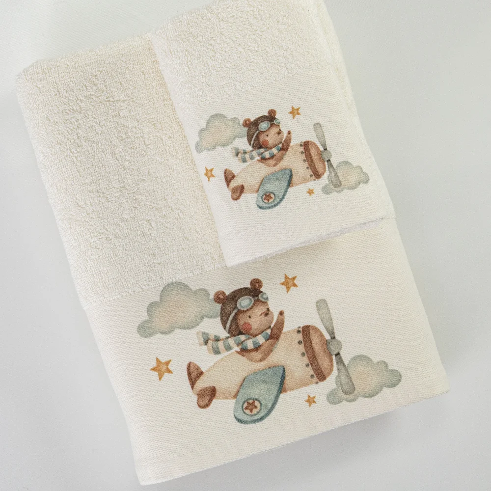 Original price was: 19.12€.16.28€Η τρέχουσα τιμή είναι: 16.28€.Σετ πετσέτες 2 τεμαχίων, μπάνιου και χειρός, από ύφασμα φροτέ πενιέ, 100% βαμβακερό, μονόχρωμο, εκρού, με ψηφιακή εκτύπωση, σχέδιο πιλότος.Διατίθεται σε 2 χρώματα.