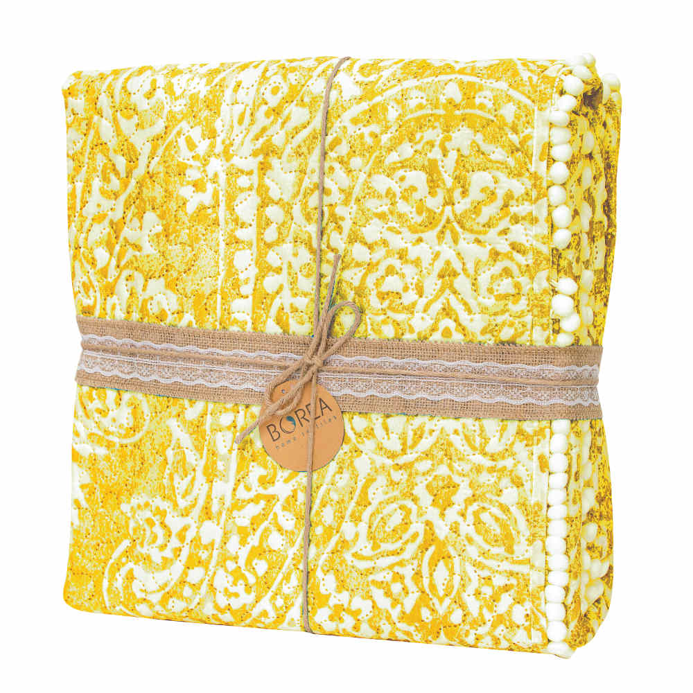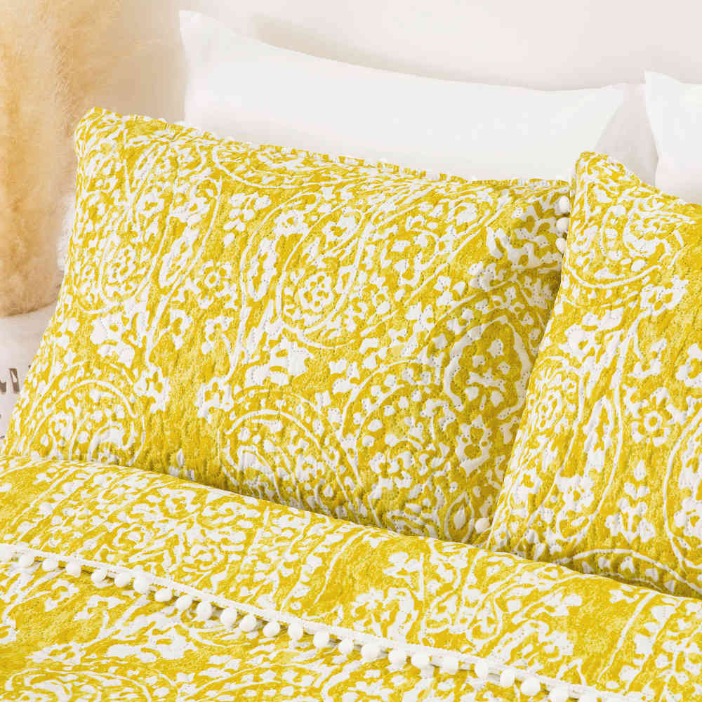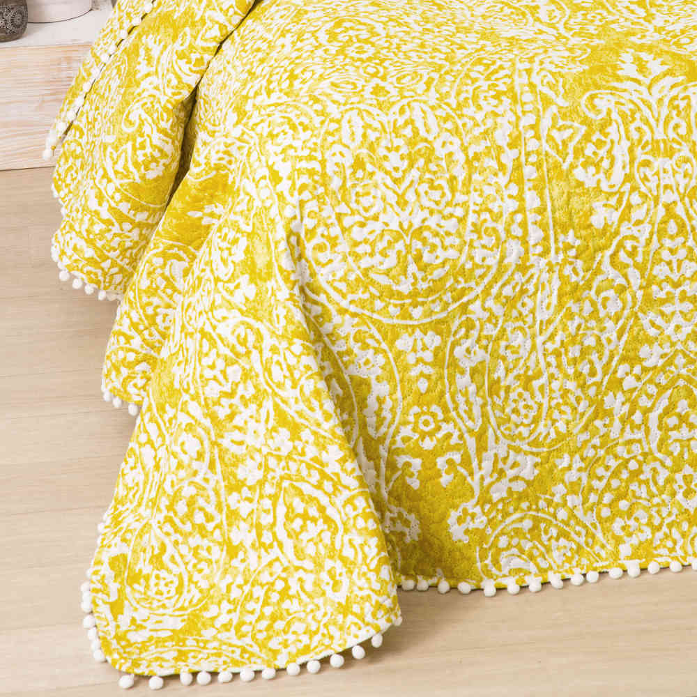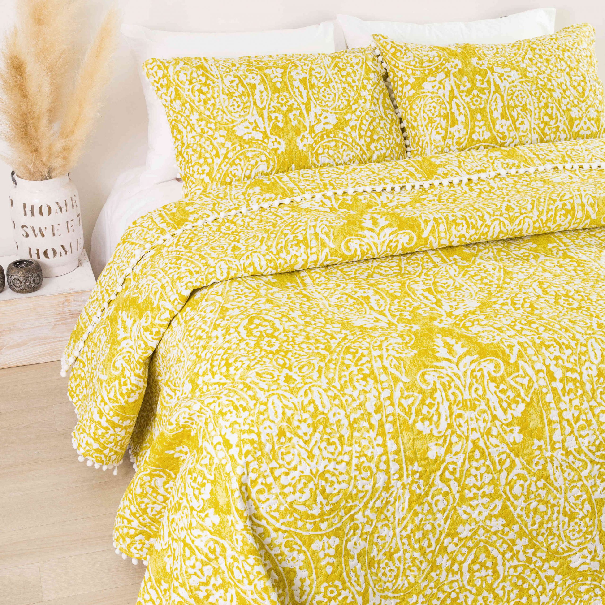 Σετ κουβερλί υπέρδιπλο με μαξιλαροθήκες από ύφασμα microfiber, 100% πολυέστερ, εμπριμέ, με γεωμετρικό σχέδιο, σε χρώμα μουσταρδί, με γραμμικό σχέδιο και pom pom στην μπροστινή όψη και στις μαξιλαροθήκες.