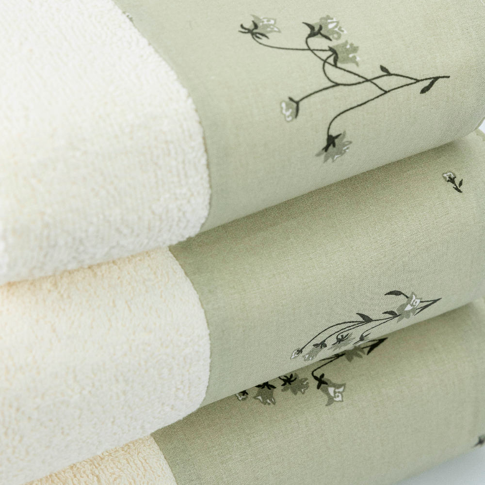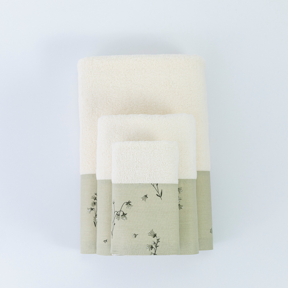 Σετ πετσέτες 3 τεμαχίων, μπάνιου, προσώπου και χειρός, από ύφασμα φροτέ, πενιέ, 100% βαμβακερό, με διακοσμητική φάσα ύφασμα. Διατίθεται σε 3 χρώματα.
