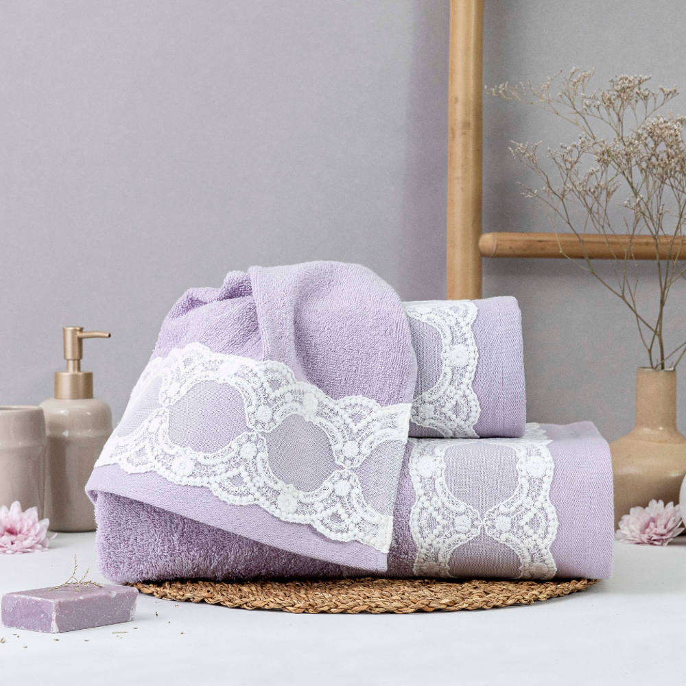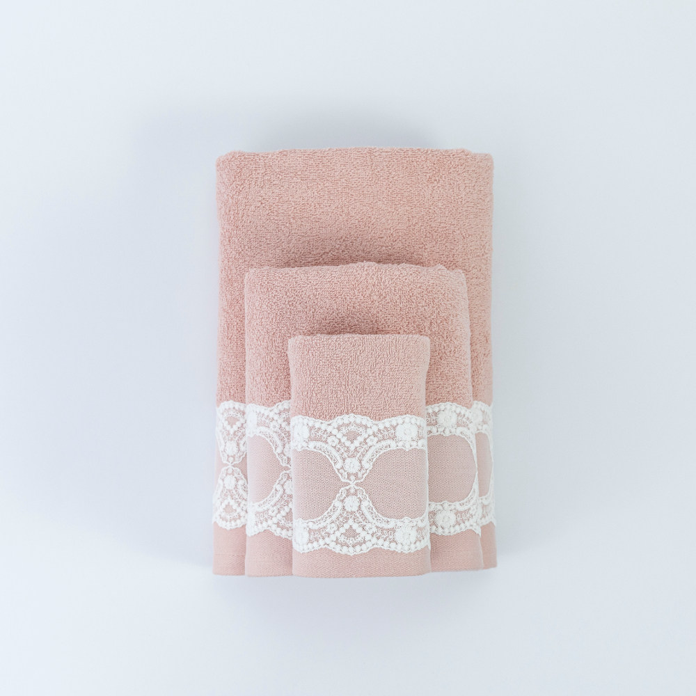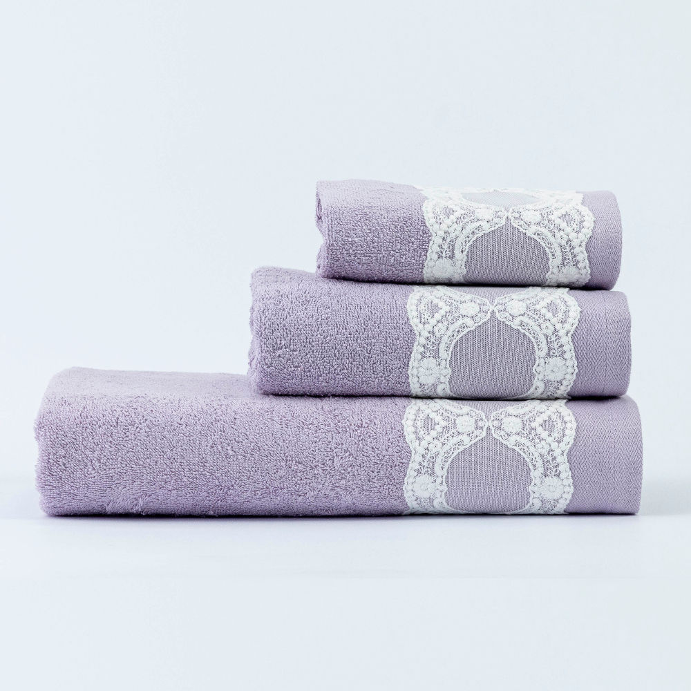 Σετ πετσέτες 3 τεμαχίων, μπάνιου, προσώπου και χειρός, από ύφασμα φροτέ, πενιέ, 100% βαμβακερό, με διακοσμητική δαντέλα. Διατίθεται σε 5 χρώματα.