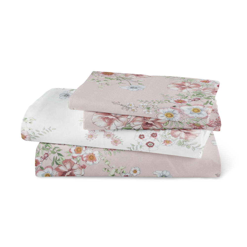 Σετ σεντόνια υπέρδιπλα με μαξιλαροθήκες από ύφασμα μερσεριζέ, 160 κλωστών, 100% βαμβακερό, συνδυασμός εμπριμέ φλοράλ μοτίβου, σε χρώμα ροζέ.